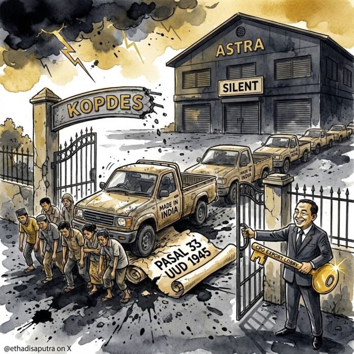 JAKARTA Februari 2026. Di balik hingar-bingar peluncuran program Koperasi Desa (Kopdes), tersimpan sebuah skandal kebijakan tata niaga yang sangat rapi. Investigasi kami menemukan bahwa masuknya 105.000 unit pikap impor asal India bukan sekadar upaya memenuhi kebutuhan transportasi desa, melainkan bagian dari skema trade-off atau barter strategis untuk melancarkan ekspor CPO (Crude Palm Oil) para pemilik konsesi besar ke pasar Asia Selatan.