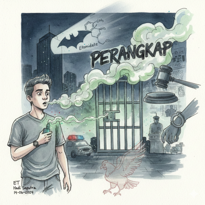 Saya harus tertawa kecil membaca berita ini. Tertawa miris sebenarnya. Bayangkan betapa kagetnya ribuan anak muda di luar sana. Si Ujang di Bandung, Si Budi di Surabaya, atau Si Asep di Tasikmalaya. Mereka tidak tau apa itu Etomidate. Sumpah, mereka tidak tau. Mereka hanya tau beli liquid di toko daring, tuang ke cartridge, hisap, dan ngebul. Tiba-tiba, “Brak!”. Pintu kamar digedor polisi. Tangan diborgol. Alasannya? Mengonsumsi narkotika golongan I.